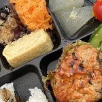 一晩寝かせたのかしっかり味が沁み込んだ唐揚げ、ソースの絡み具合が多すぎず少なすぎずちょうどいいひじき入りハンバーグ。
